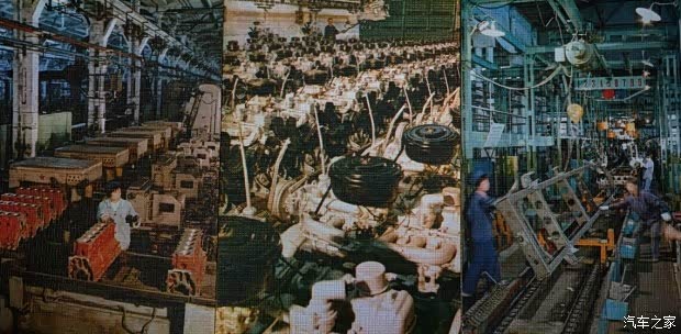 左:“二汽”发动机缸体铸造车间特写。 中:发动机成品。 右:车身大梁装配线。