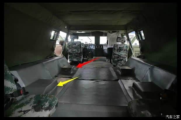 上图是已经服役的1代猛士装甲车指挥型内部特写。前排指挥员(少校)操控集成在仪表台副驾驶员侧信息终端,并可通过固定在仪表台中央的2代北斗定位系统获取车辆动态。后排参谋人员在佩戴钢盔的工况下,距离车顶仍然有一定空间,通信系统放置在中央通道。1代猛士装甲车在空间上相对勇士以及BJ80有着一定优势,而长轴2代猛士装甲车的空间优势主要集中在后部载员和搭载功能模块的多样性上。