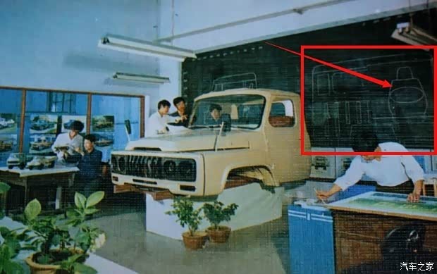 上图是80年代晚期“二汽”的研发中心特写。点击图片可以大图模式观看,画面左侧2台1:16比例的模型分别是,5吨改款EQ系列载具和“八平柴”早期概念车。中间的油泥模是1:1全尺寸3.5吨民用EQ系列载重车(深黑色前进气格栅是亮点)。右侧黑板上的驾驶舱内比例图也很有时代特征。(此图电子版权为笔者所有)。