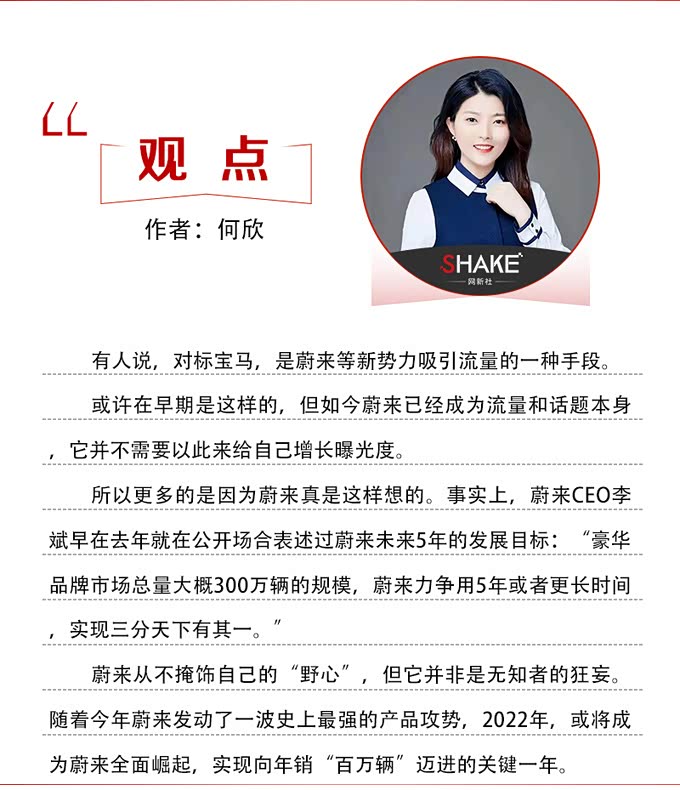 蔚来从不掩饰自己的“野心”,但它并非是无知者的狂妄。随着今年蔚来发动了一波史上最强的产品攻势,2022年,或将成为蔚来全面崛起,实现向年销“百万辆”迈进的关键一年。