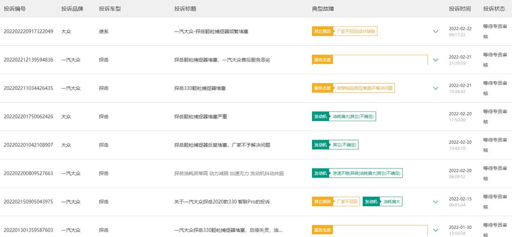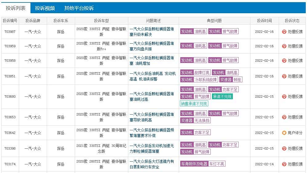 从各个车主投诉的车型来看,比较集中的是2020款、2021款的探岳330车型,也是2.0T低功率版车型,探岳搭载了三款发动机,1.4T(280车型)、2.0T低功率(330车型),2.0T高功率(380车型),探岳330车型装配了颗粒捕捉器,又是主销车型,所以因为颗粒捕捉器引发的问题较多。