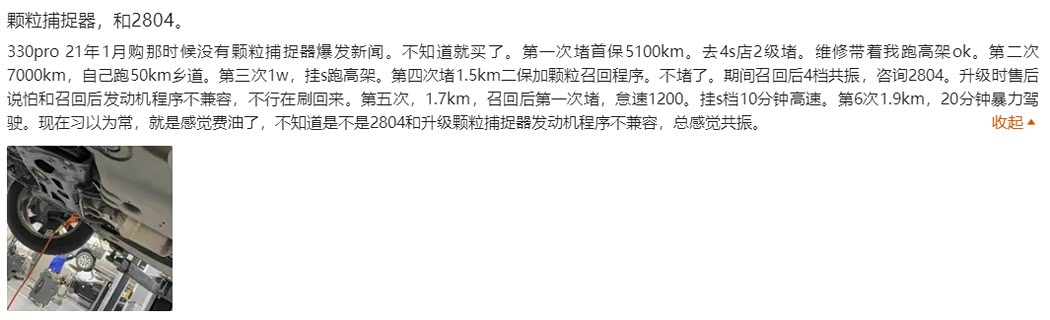 投诉信息1:330pro 21年1月购,那时候没有颗粒捕捉器爆发新闻。不知道就买了。第一次堵首保5100km。去4s店2级堵。维修带着我跑高架ok。第二次7000km,自己跑50km乡道。第三次1w,挂s跑高架。第四次堵1.5km二保加颗粒召回程序。不堵了。期间召回后4档共振,咨询2804。升级时售后说怕和召回后发动机程序不兼容,不行在刷回来。第五次,1.7km,召回后第一次堵,怠速1200。挂s档10分钟高速。第6次1.9km,20分钟暴力驾驶。现在习以为常,就是感觉费油了,不知道是不是2804和升级颗粒捕捉器发动机程序不兼容,总感觉共振。