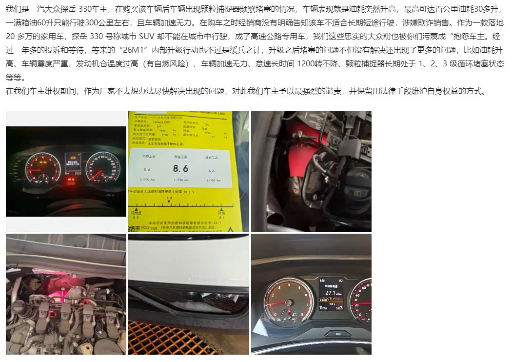 作为一款落地 20 多万的家用车,探岳 330 号称城市 SUV 却不能在城市中行驶,成了高速公路专用车,我们这些忠实的大众粉也被你们污蔑成“抱怨车主。经过一年多的投诉和等待,等来的“26M1”内部升级行动也不过是缓兵之计,升级之后堵塞的问题不但没有解决还出现了更多的问题,比如油耗升高、车辆震度严重、发动机仓温度过高(有自燃风险)、车辆加速无力、怠速长时间 1200转不降、颗粒捕捉器长期处于 1、2、3 级循环堵塞状态等等。