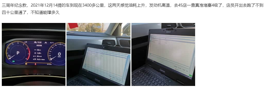 投诉信息3:三周年纪念款,2021年12月14提的车到现在3400多公里,这两天感觉油耗上升,发动机高温,去4S店一查真准堵塞4级了,店员开出去跑了不到四十公里通了,不知道能撑多久。