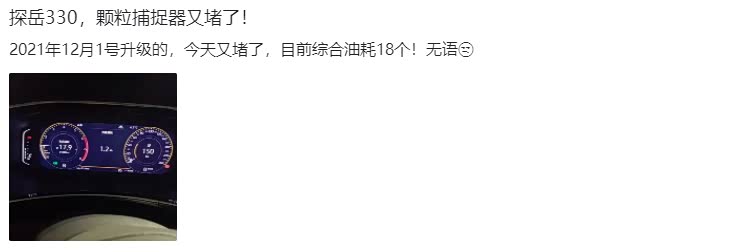 投诉信息2:探岳330,颗粒捕捉器又堵了!2021年12月1号升级的,今天又堵了,目前综合油耗18个!无语。