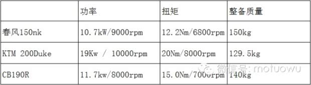 再对比一下春风150nk以及KTM 200 DUKE的功率,两款车型皆为水冷电喷。春风150nk的最大功率为10.7kW(15Ps)/9000rpm,12.2Nm/6800rpm。整备质量150千克,KTM 200 Duke最大功率19Kw / 10000rpm,最大扭矩20Nm/8000rpm空车重量129.5千克。CB190R最大功率11.7kw/8000rpm,扭矩15.0Nm/7000rpm,整备质量140千克,从参数上来看,184cc排量的CB190R也仅仅比排量更小的149.4cc的春风150nk略好,到底是什么鬼,实车都还没出来网络上就一片叫好声,各种表扬,更别说上打250级别的其余进口车型。