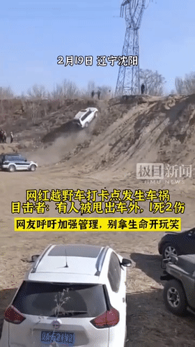 而始发地同样是一处位于沈阳西峡谷的“网红坡”,网上流传的视频显示,在一个没有植被看上去比较陡峭的土坡上,一辆白色越野车即将爬上坡顶时,突然失控失去抓地力,随后发生侧翻并往下坡下翻滚……