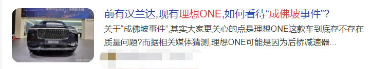 事发后,有媒体报道称“这辆理想ONE断轴了”,也有媒体认为是“理想ONE后分动箱爆了”,甚至还挖坟汉兰达,就连“官方”也不忘来蹭一下热度……