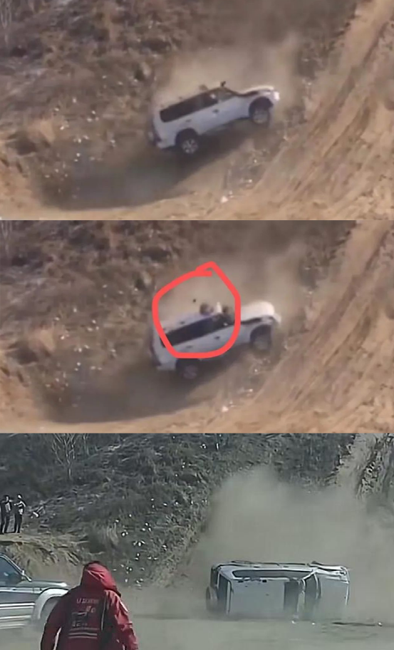 就在翻滚过程中,一个人在白色越野车中的天窗中被抛到车外,并重重砸到的地上,而且还被真正翻滚的越野车碾压。