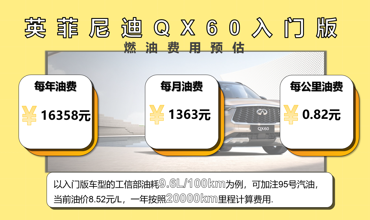 燃油费用方面,东风英菲尼迪QX60入门自动车型搭载的是2.0T发动机,最大功率高达185kW,最大扭矩376N·m,当前油价8.52元/L,我们以入门版车型的工信部油耗9.6L/100km为例,一年按照2万公里里程计算费用,可以算出东风英菲尼迪QX60一年的燃油费用是16358元。