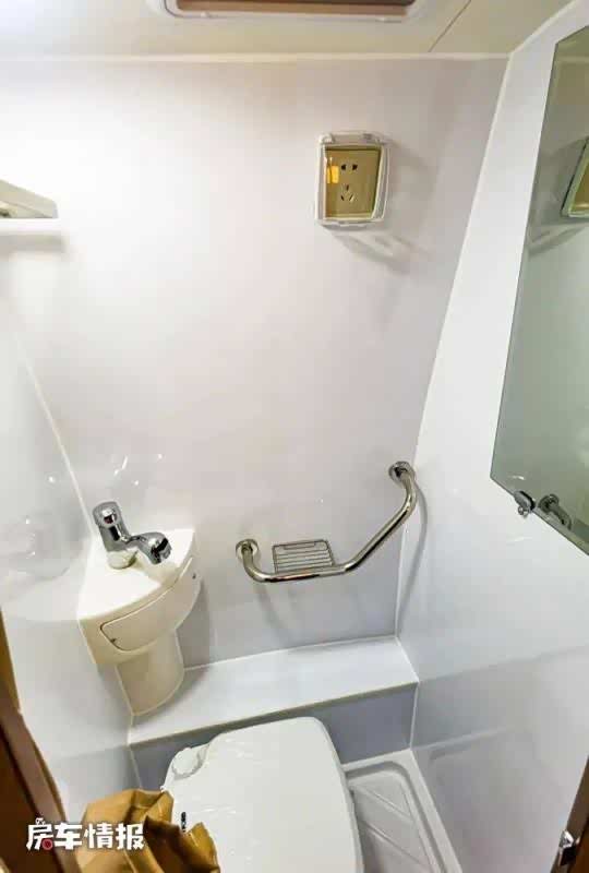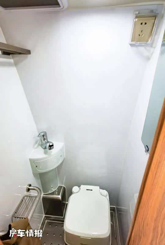 这辆车同样采用了独立的卫浴室设计,内部也是提供便携式的马桶,以方便后期搬至车外拥有更宽敞的淋浴空间,除此之外洗手台盆、抽拉式花洒和梳妆镜的配置则是一样的。