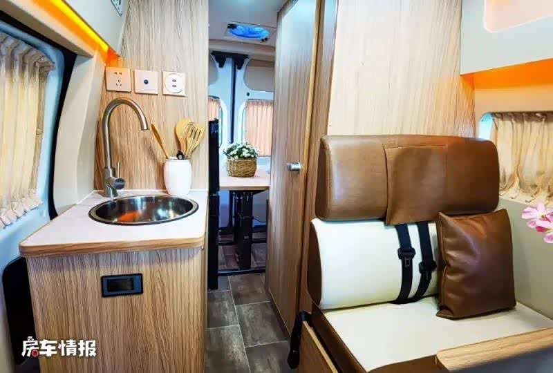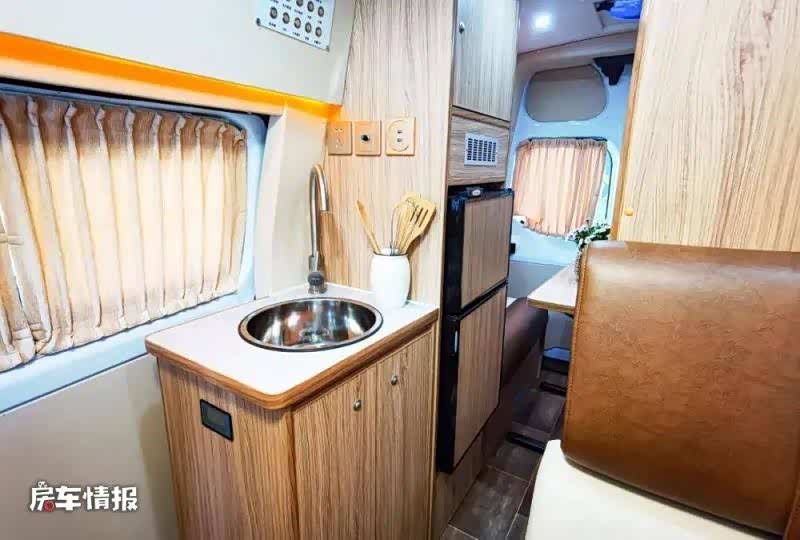 车厢中部则是全车的厨卫区域,靠近乘客门处的是一个带有不锈钢水槽的小操作台,后方则提供了上下双开门的冰箱,后期还可以加装电磁炉和微波炉以满足更多的烹饪需求。