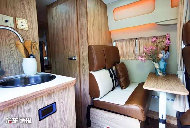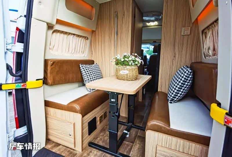 最前方主驾驶座椅后方是一个双人沙发+餐桌的设计,更适合两个身材稍微瘦小的人,而车尾部的会客区则是四人对卡座+可移动餐桌的布局,空间相较前方的固定会客区更宽敞一些,而且移动餐桌在天气好的时候还可以搬至到车外使用。