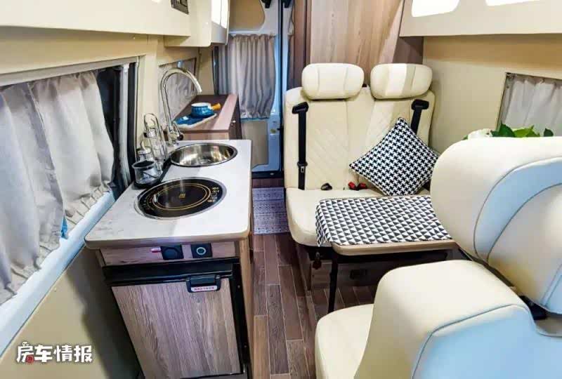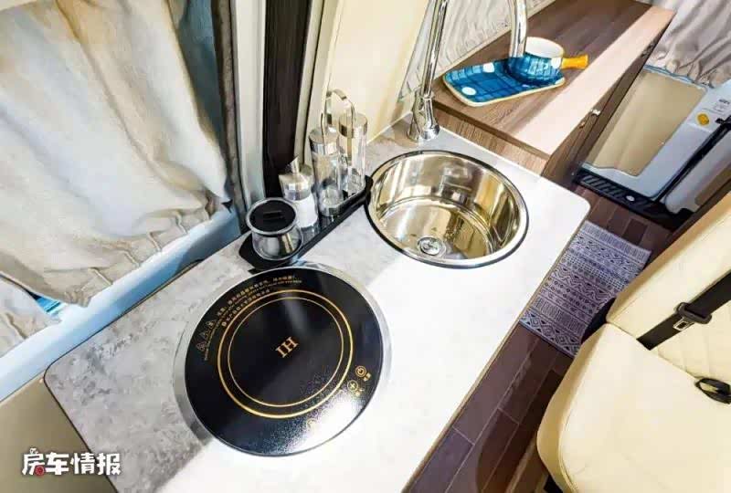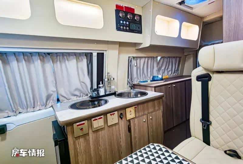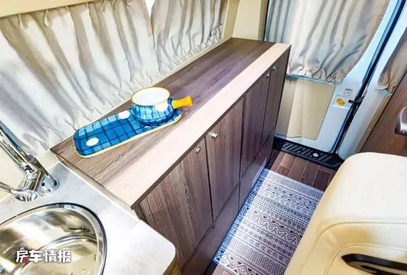 相比第一款来说这辆车的前后贯通式厨房操作台则是最大的亮点,最前方是主要的操作台,带有电磁炉、不锈钢水槽、车载冰箱等基础的厨房设施,后方则是一个储物柜的设计,既可以用来备菜,也可以用来储物。
