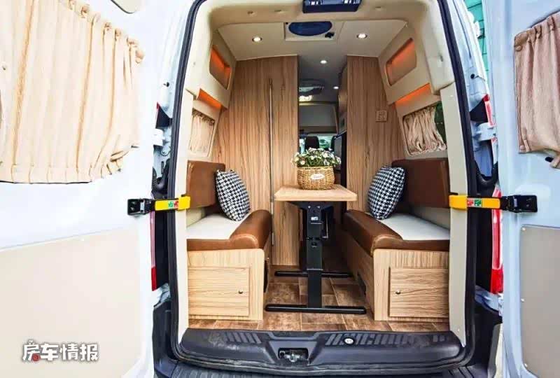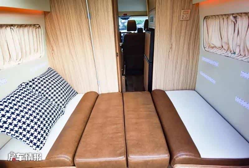 第一款内部采用了横置后尾床的设计,平时不变床的情况下相当于整辆车一前一后有两个会客就餐区。