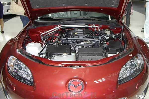 MX-5的引擎仓布局,看到这颗MZR引擎布置是非常靠后的,前方的空间很大,是正宗的前中置布局设计。MZR引擎在马自达3,马自达6,马自达5上都可以看见,不过MX-5搭载的2.0L引擎采用纵置布局,进排气布局与其他横置车型略有不同,正是引擎的通用性,平摊了MX-5的研发和制造成本,低廉的售价助力其成为畅销小跑车的典范。