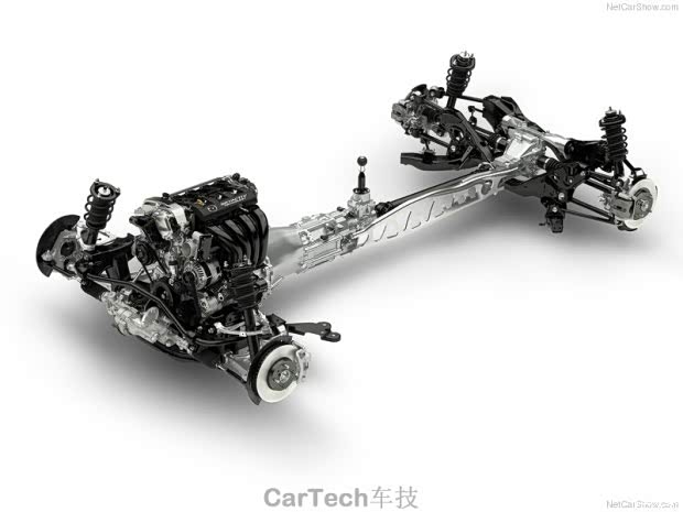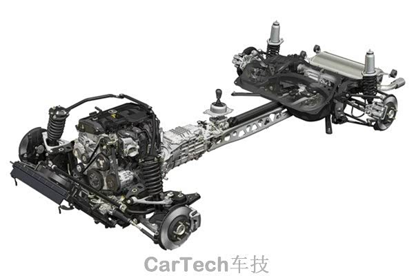 上图是MX-5(NC)的动力总成及悬架总成,可以看到NC采用标准的FR布局,引擎的大部分都位于前轴之后,也就是说MX-5其实是FMR前中置布局的设定,这也是为什么MX-5会有优异的前后轴重量分配(50:50)的缘由。类似的设计在本田S2000,或是宝马Z4上都能见到。