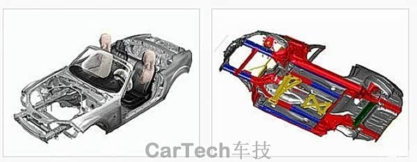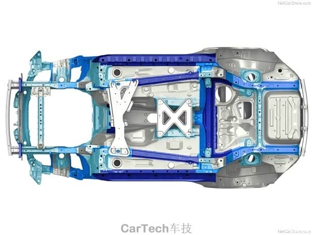 从车身下方也能看清其结构,蓝色和红色标注的部分都是受力的结构,而黄色的部分则是提升底盘抗扭刚性的补强结构,类似于改装车加装的车身强化底盘拉杆。不过这样的结构MX-5原厂就已经加装,开蓬的MX-5(NC)是非常重视车架刚性的,良好的车架刚性是灵敏操控特性的奠基石。