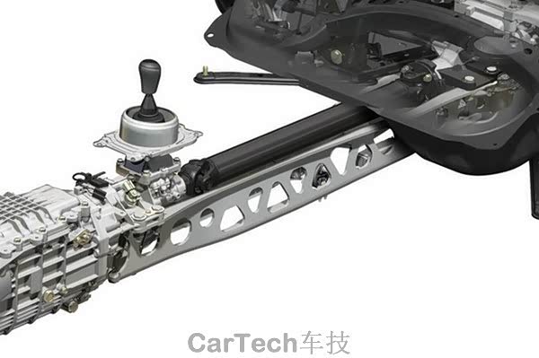 位于车身中部的连接结构,在传动轴下方,连接了波箱到后差速器,形成了硬链接,让传动轴旋转时对车架产生的扭曲力降至最低,同时也增强了车身中部刚性。补强结构采用了很多镂空的设计,是为了轻量化挖尽心思。