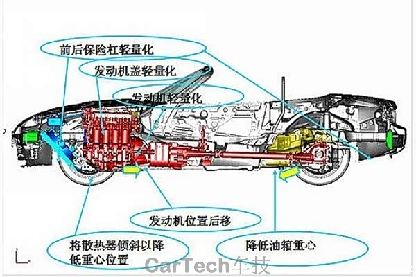 上图也说明了NC为营造低重心的几项措施,包括倾斜布置的水箱,在不降低太多撞风效果的同时大幅降低了水箱重心,后移的引擎带来良好的配重,绕开前悬架也能使引擎的布置位更加贴地,油箱的位置也经过细心考量,此外前后保险杠和引擎盖的轻量化,也能使车身重心更加贴地。