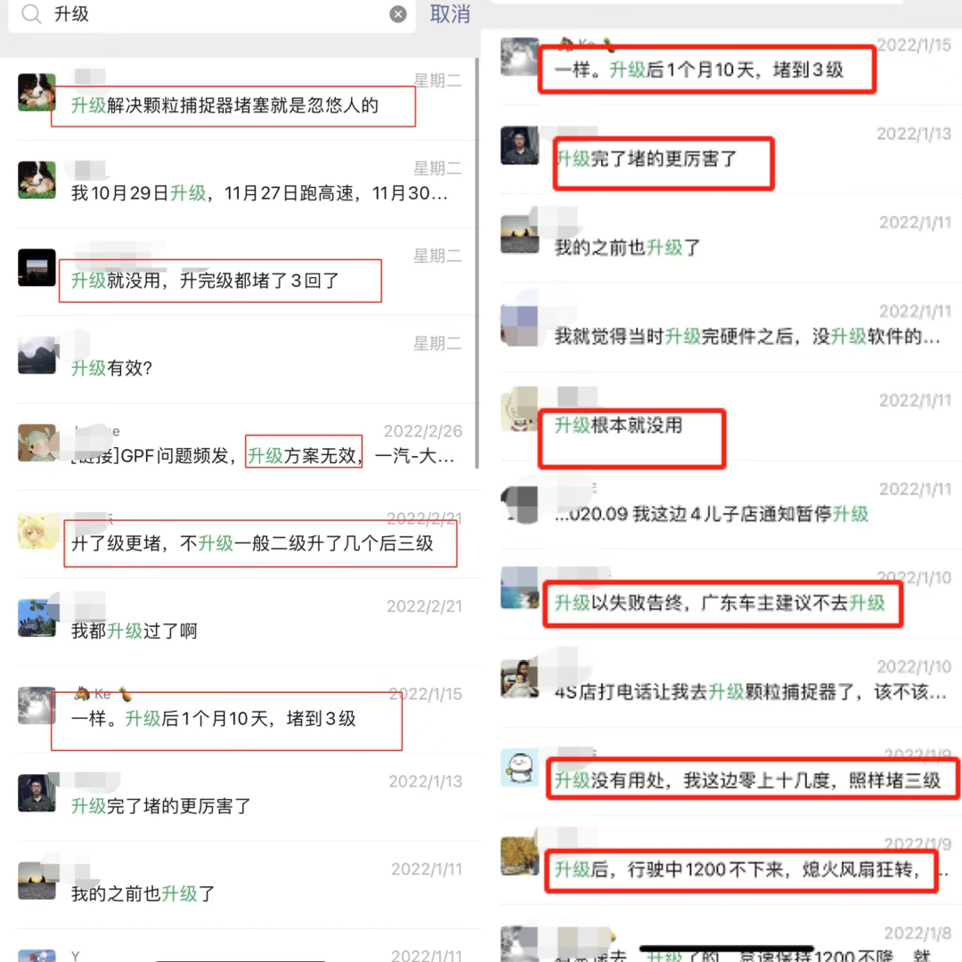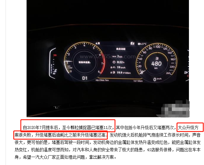 依然有不少探岳车主反馈,升级后不久,颗粒捕捉器依然堵塞,甚至比升级前油耗还高。有的车辆还出现动力下降,换挡顿挫等现象。