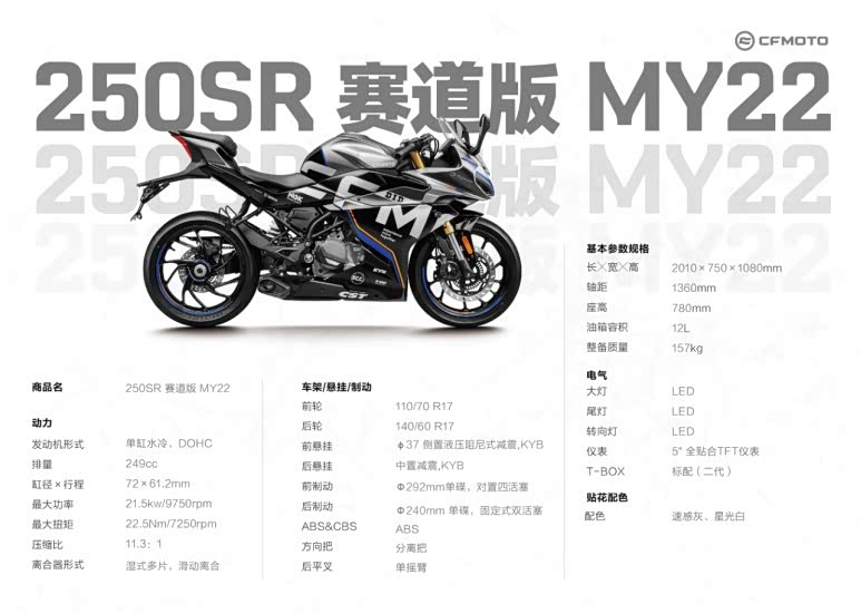 1、发动机功率提升,CFMOTO这台250cc发动机再次升级,动力提升5%,最大功率提升至21.5kw,峰值扭矩提升至22.5N·m,别看动力参数的变化不大,但是整车的减震则会放大动力的提升,带来更猛的起步加速。现款250SR上配有的滑动离合、ABS等,在250SR 赛道版MY22上依然标配。