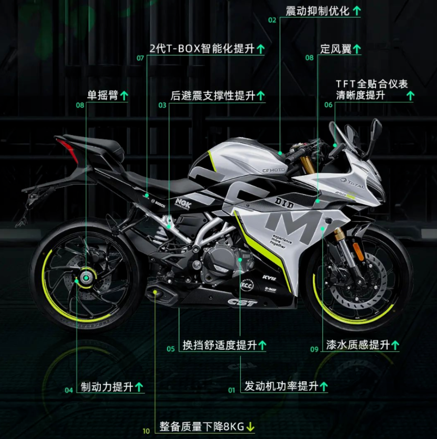 不过,春风250SR赛道版并不只是用上了单摇臂这么简单,而在在过往的日子里根据6万+车友的检验和意见再度进化,在这台250SR赛道版MY22之上实现了“九升一降”的全面升级,筑牢了其在250CC仿赛市场的坚实领导基础。