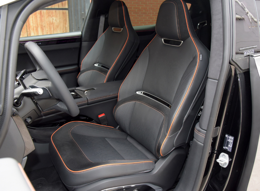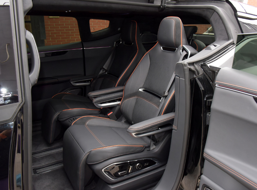 高合HiPhi X车内座椅采用真皮面料包裹,功能方面标配主副驾驶座椅电动调节,前排座椅加热,前排电动座椅记忆,副驾驶位后排可调节按钮等。新车车内前排座椅采用一体式设计,内部填充物柔软,包裹性和支撑性都属于上游水准。