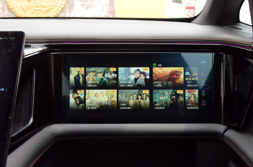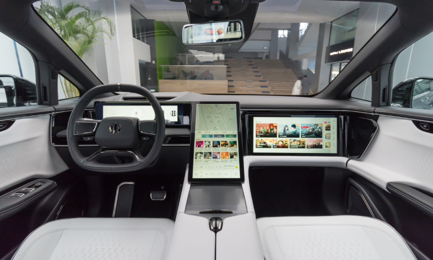 高合HiPhi X的内饰设计较为简洁,车内除了三块大屏幕之外基本没有实体按键,大部分的区域都采用了真皮材质包裹,用料方面可谓是十分高端奢华。新车主驾驶正前方的四幅方向盘为平底式设计,造型较为运动化,支持电动四向调节。两侧功能按键区域实际为触摸屏,有种游戏手柄的感觉。中控台上16.9英寸的竖置中控显示屏幕几乎集成了车辆的所有设置和功能,不过大屏幕通常会存在成为指纹收集器的尴尬,该车也没有幸免。
