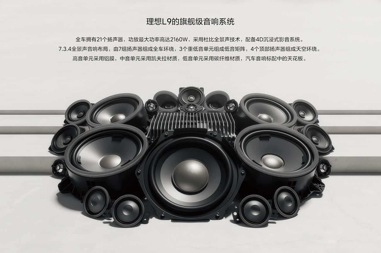 内饰部分,使用了方向盘上全液晶屏幕以及大尺寸的HUD系统,此外,为了前排布局的规整性,新车还采用了怀挡设计。特别的是理想L9的音响是理想汽车自研,作为标配新车将拥有21个扬声器,外放功率达到2160W,打造车内7.3.4杜比全景立体声。