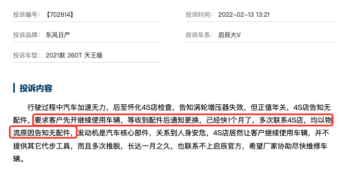 我们在用户投诉的案例中发现了一位用户,发动机涡轮增压器失效,需要更换。但是已经等了一个月的时间,依然被告知无配件。很明显,这就是因为发动机不是启辰自己生产,而这些关键零部件的生产,运输,启辰是做不了主的。