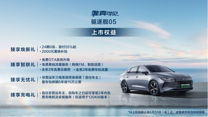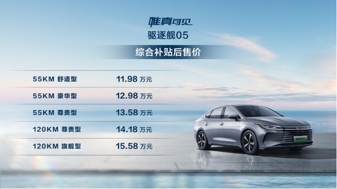 此次驱逐舰05共发布5款车型,综合补贴后售价为11.98~15.58万元,同时为用户准备了包括0息购车、数据流量、维修保养、充电权益在内的多项臻享礼遇。