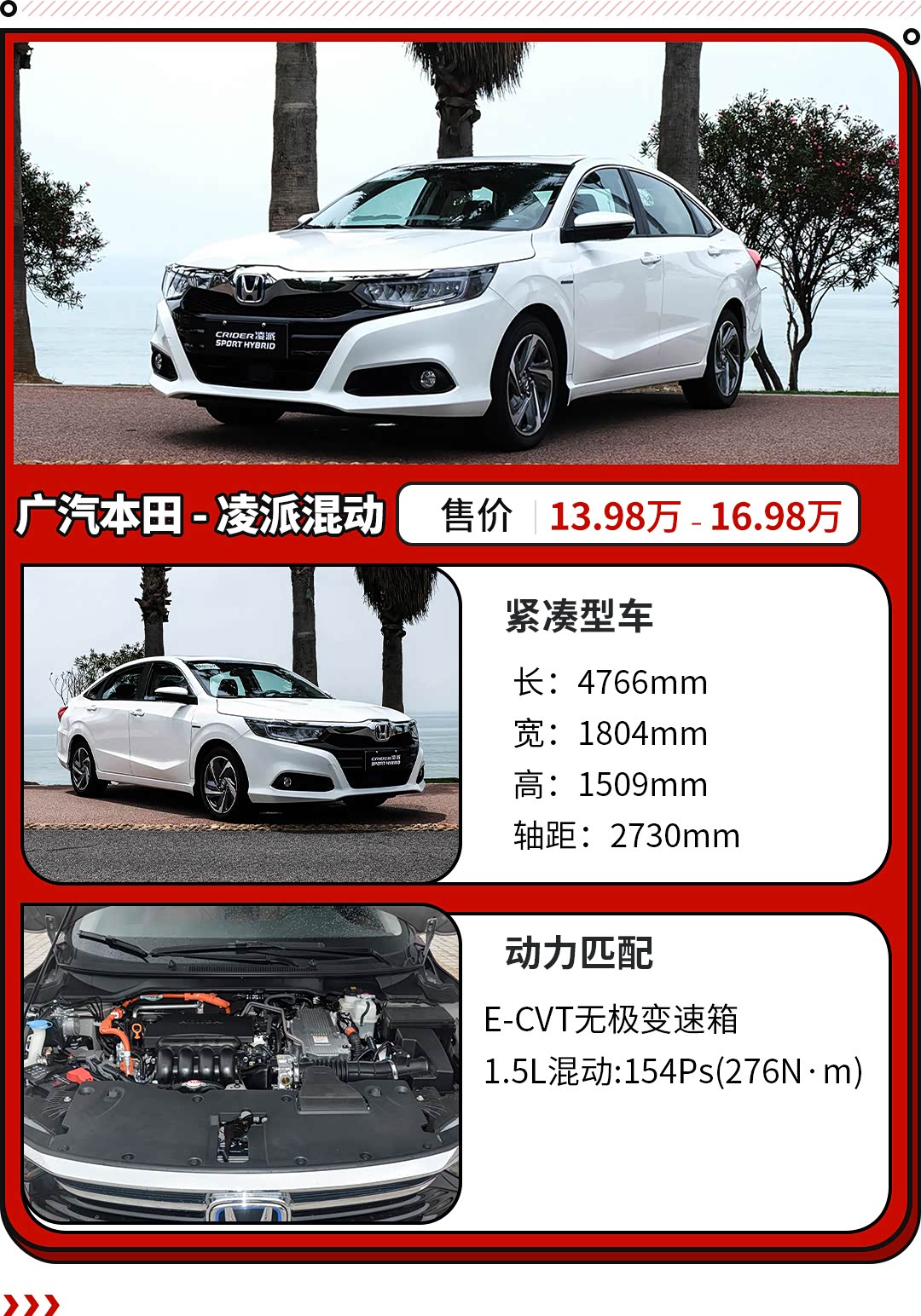本田旗下的 凌派(参数|询价)在上一款车型使用的是三缸发动机,国人接受度自然不高,本田的四缸混动系统搭载在凌派身上也一并解决了三缸的这个槽点,销量也有所好转。iMMD混动系统赋予了凌派优秀的燃油经济性,在拥堵市区的工况下仅有5L左右的油耗,高速巡航和不拥堵时油耗更是在5L以下。除此之外,iMMD也让凌派拥有了更好的行驶静谧性和平顺性。