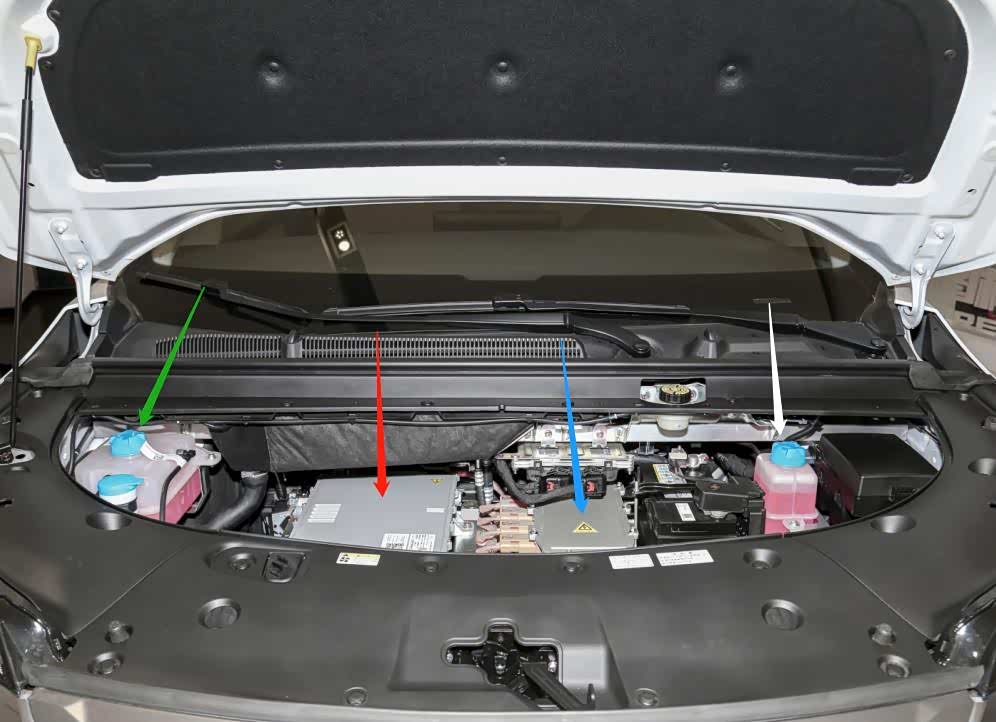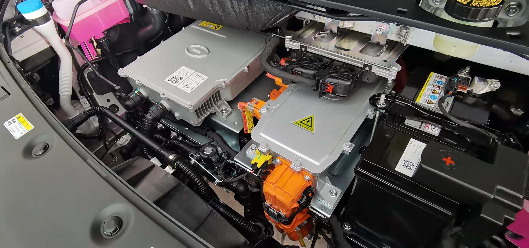 上图为广汽AION V前部动力舱诸多分系统技术状态特写。