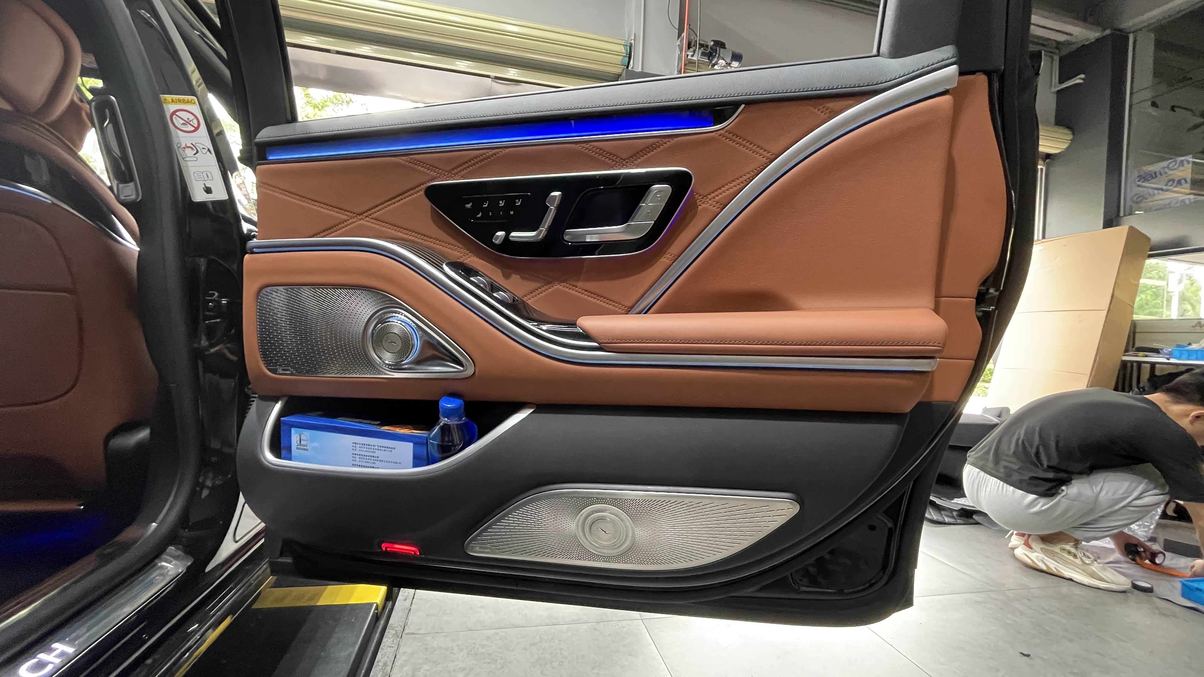 前门门板已经集合了大柏林之声音响高中低音,主动式环境氛围灯,钢琴黑条纹桃木饰板,一块车门门板上多层次多功能的体现出迈巴赫S级的科技感和豪华感。