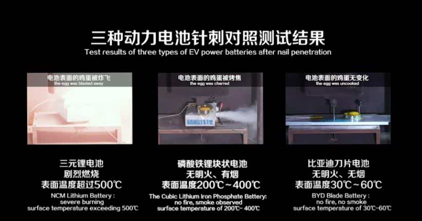 而最为关键的是,基于铁锂技术打造的刀片电池安全性更好,在比亚迪方面公布的测试数据中,同样的测试条件下,三元锂电池在针刺瞬间出现剧烈的温度变化,表面温度迅速超过500℃并开始剧烈燃烧;传统磷酸铁锂块状电池无明火、有烟,表面温度达到200℃~400℃;刀片电池在穿透后无明火、无烟,电池表面温度仅有30℃-60℃左右。