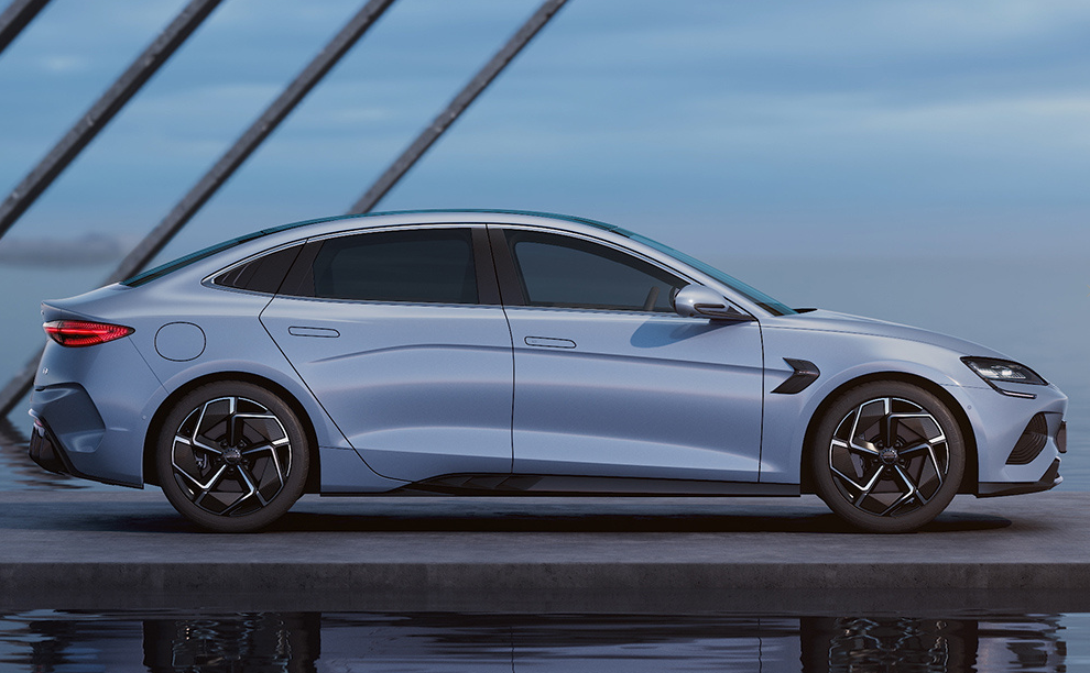 比亚迪海豹车身部分在设计上也采用了全新的设计理念,车身部分线条设计非常流畅,车顶方面采用了经典的溜背式设计,狭长的车窗周边添加了一圈镀铬装饰条,后排车窗部分提供了隐私玻璃,腰线方面则是采用了分段式设计,在车门部分的线条处理上增添了不少时尚潮流的元素,年轻运动感很强。值得一提的是,新车还提供了数款全新造型的轮毂,镂空设计非常精致。