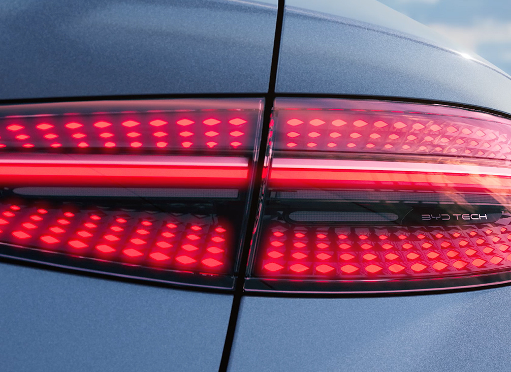 新车在车尾部分的设计上增添了许多全新的时尚元素,整个车尾部分的设计非常饱满,层次感也非常不错。鸭尾式扰流板下方添加了比亚迪海豹英文LOGO,新车采用了贯穿式的LED尾灯设计,灯腔内部采用了点阵式的灯带,造型非常精致,点亮之后辨识度非常不错。在车尾后保险杠下方的尾部扩散器将车尾部分的运动感营造的非常不错,帅气十足。