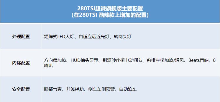 最后是顶配的超辣旗舰版,售价来到了18.99万,比次顶配的酷辣款贵了2万元,在配置上增加了IQ.Light矩阵式前大灯、HUD抬头显示、膝部气囊、并线辅助、倒车车侧预警、自动泊车等提升安全性和便利的配置,此外还增加了8扬声器的Beats音响、方向盘加热、前排座椅加热/通风/电动调节等,整体舒适性也有进一步提升。对于预算充足的消费者来说,这些配置多花2万也是值得的,该版本适合预算够充足并且追求品质的消费者。