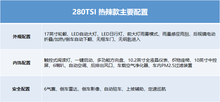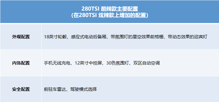 在外观设计层面,上汽大众凌渡L还是蛮有亮点的,尤其是贯穿式日行灯、无框车门、掀背尾门等设计,相信会受到很多年轻人的喜爱,同时更加科技感的内容以及诸多基础配置的下放,也进一步提升它的竞争力。除了顶配,凌渡L其余三款车型价格相差1万元,其中数售价16.99万的280TSI 酷辣款配置升级最超值,也是全系最值得买的版本。