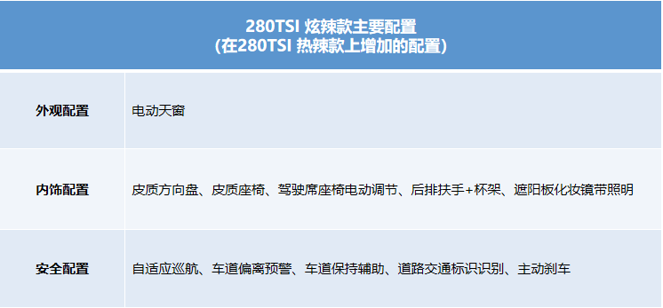 炫辣款车型比热辣款贵了1万元,但配置上的提升不少。首先搪塑方向盘、织物座椅升级为仿皮材质,同时增加了电动天窗、驾驶席座椅电动调节、遮阳板化妆镜、后排中央扶手等配置,并且还搭载了带有ACC自适应巡航、车道偏离预警、车道保持辅助、道路交通标识识别、主动刹车等在内的智能辅助驾驶功能,这1万元花得还是很值的。