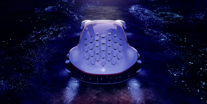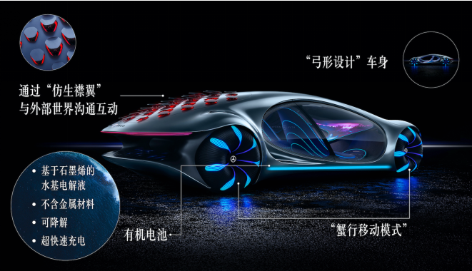 刚才提到的VISION AVTR概念车的设计,结合了电影《阿凡达》中“潘多拉”星球生物的结构和造型,以汽车后部的33个可多向移动的表面元件打造出“仿生襟翼”,它如同变色龙的皮肤,使VISION AVTR概念车与其周围环境实现了全新互动。这些“仿生襟翼”会对来自外部的接近做出反应,并通过微妙与自然的变化与驾驶员进行沟通。