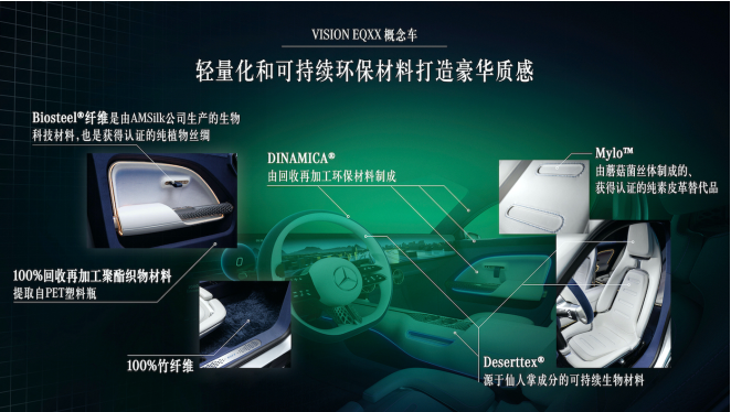 未来在车辆材质上,梅赛德斯-奔驰将自然材料与设计作为首选,采用可持续或植物型材料,表达这个时代最难能可贵的环保责任与产品价值。