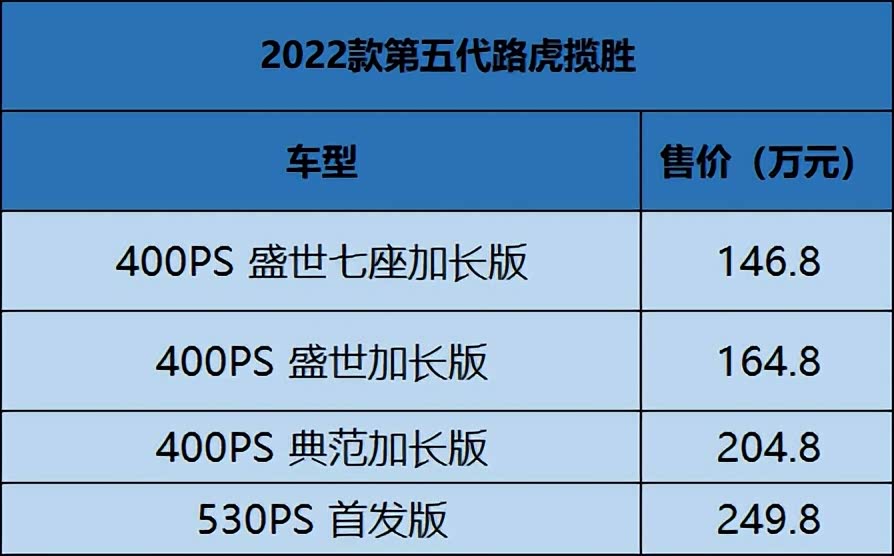 此次第五代路虎揽胜将推出四款车型,有四座、六座、七座三种版本,七座版本售价全系最低仅为146.8万元。