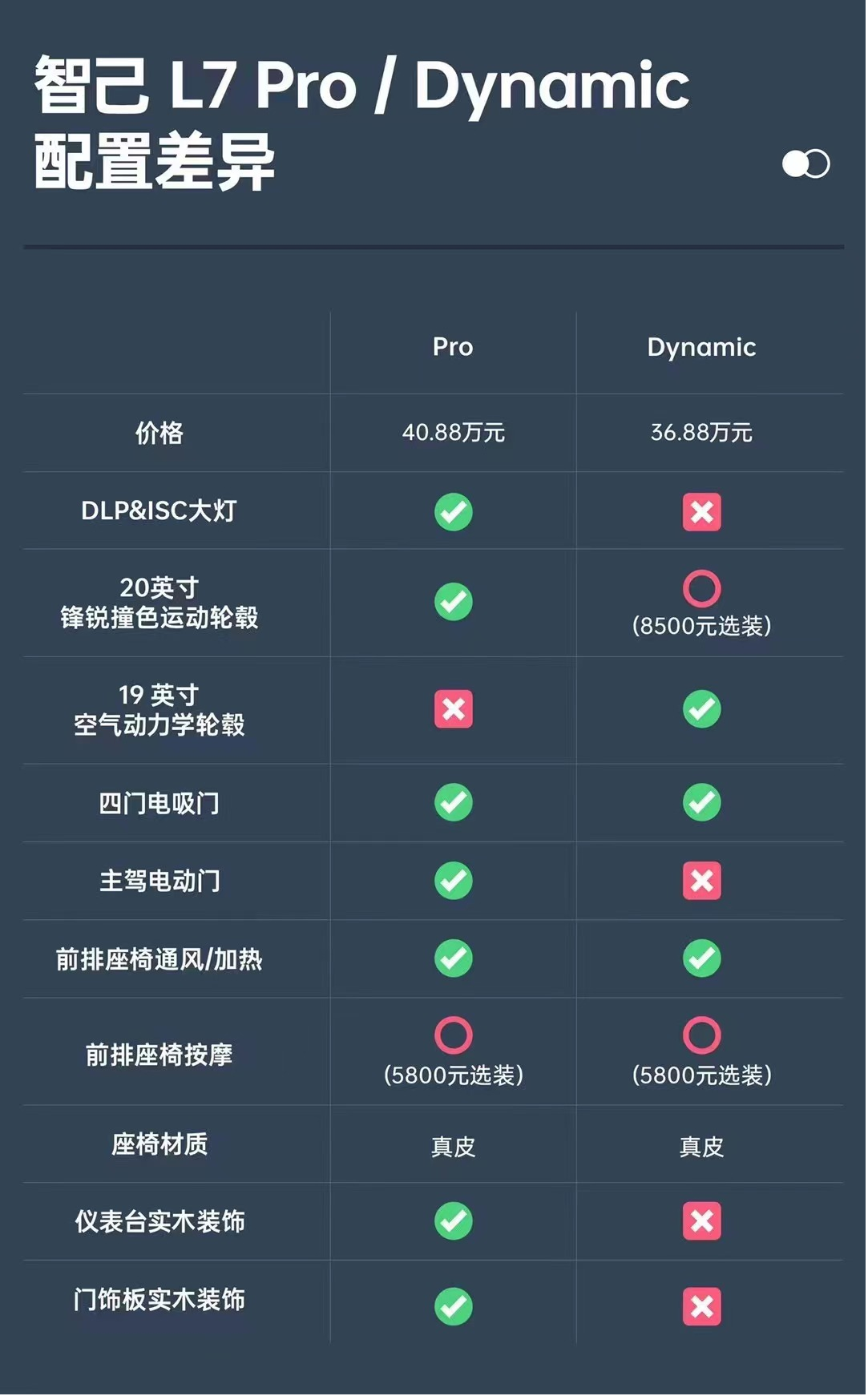 智己L7在车型配置的划分上,也是诚意十足。L7的Dynamic车型(售价36.88万)与Pro车型(售价40.88万)核心配置是一模一样的,前后双永磁同步电机、四轮转向全驱系统、车机芯片以及辅助驾驶传感器等配置,无论是动力性能还是操控感均无差异,仅仅在DLP投影大灯、ISC交后交互灯、撞色轮辋、实木内饰和主驾电动门等配置上有差异。