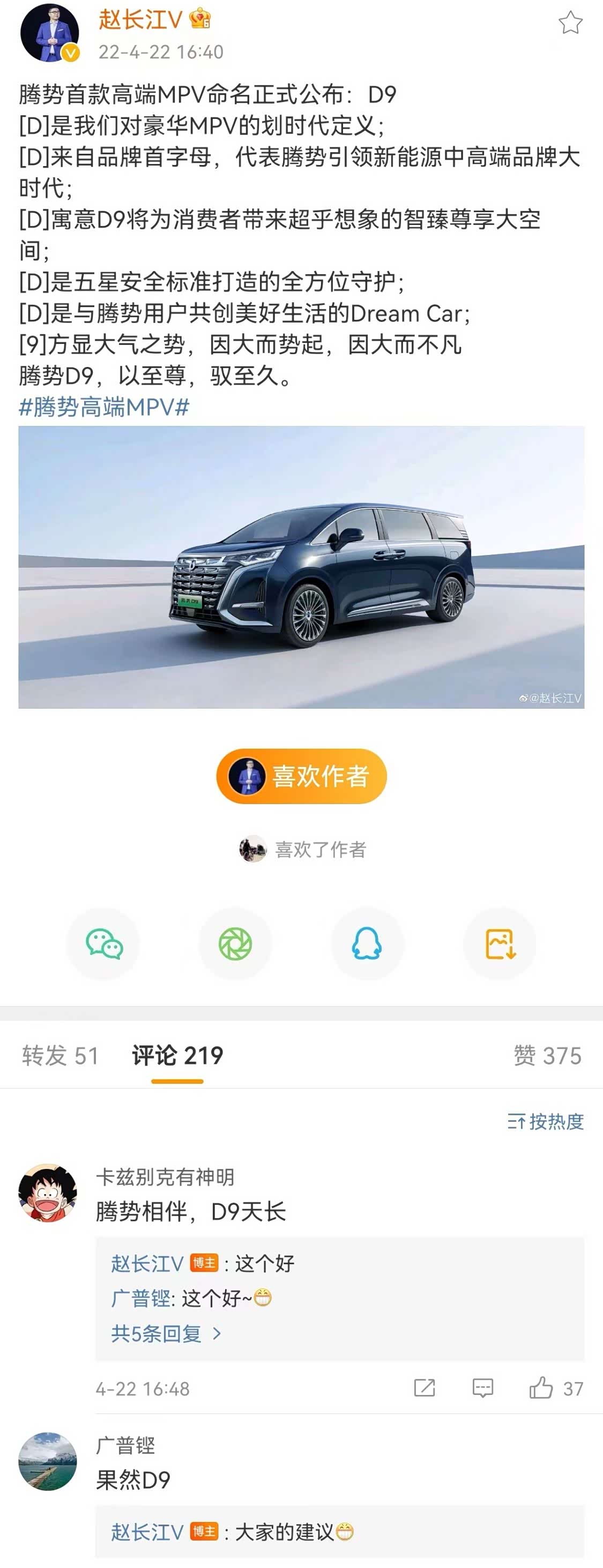 值得一提的是:这款高端豪华MPV此前进行了网络征集命名,其呼声最高的就是“D9”, 腾势D9(参数|询价)的这次命名可以说是充分考虑到了粉丝需求,而赵长江在微博评论区的留言:”听大家的建议“也印证了这一点。