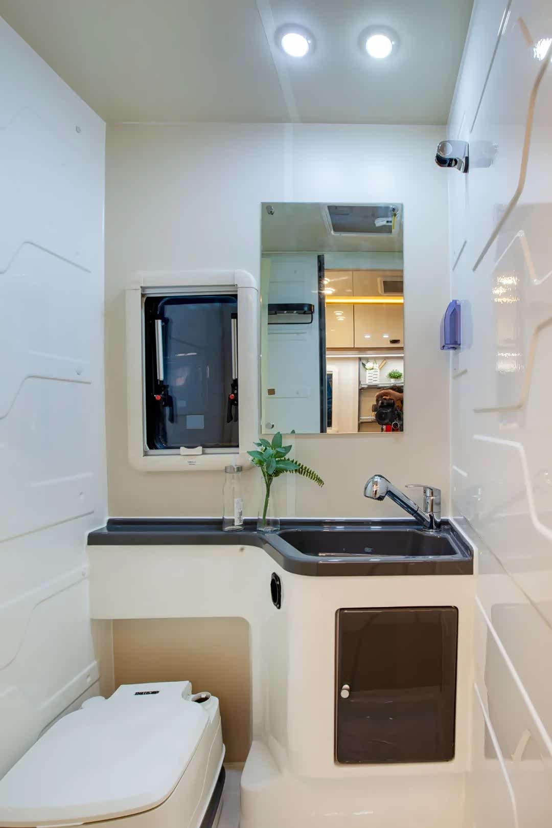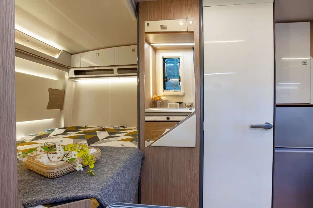 最后是车辆内部的独立卫生间,标配为便携式马桶,可选装赛特福德盒式马桶和洗衣机。淋浴设施为抽拉两用式,卫生间里面和门口均放置有梳妆镜,洗手台下方留有储物柜,车内热水则由柴油暖风热水一体机提供。
