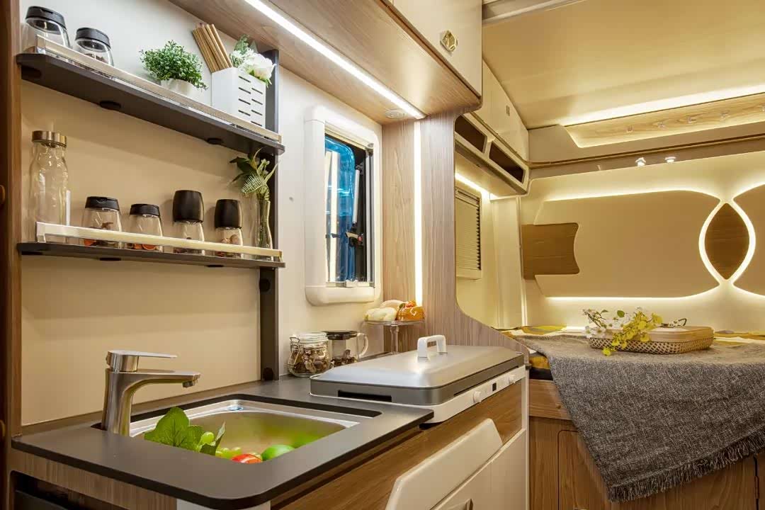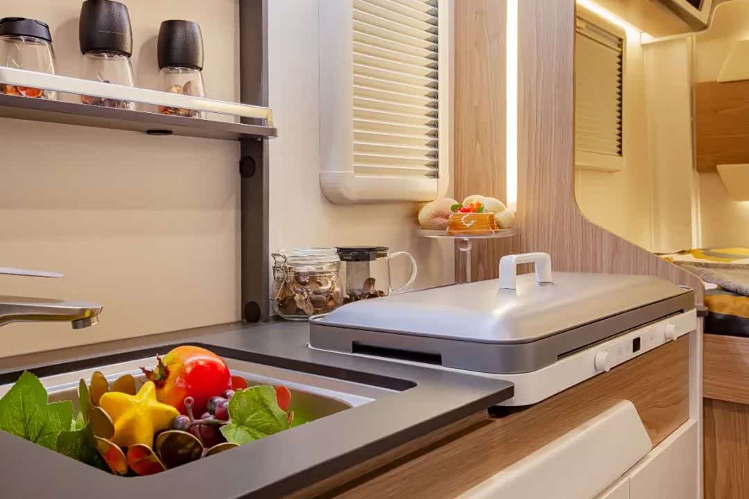 中部车内的厨房区域,主体是一个多功能的橱柜,上面特别地配置了一款两芯的烤盘,左右温度单独控制,一键开启野外烧烤盛宴。此处同时配置有洗菜池、调料置物架、顶部吊柜及分层收纳橱柜等常用厨房设施。双开门冰箱位于对侧位置,同时冰箱上下也做有储物空间。