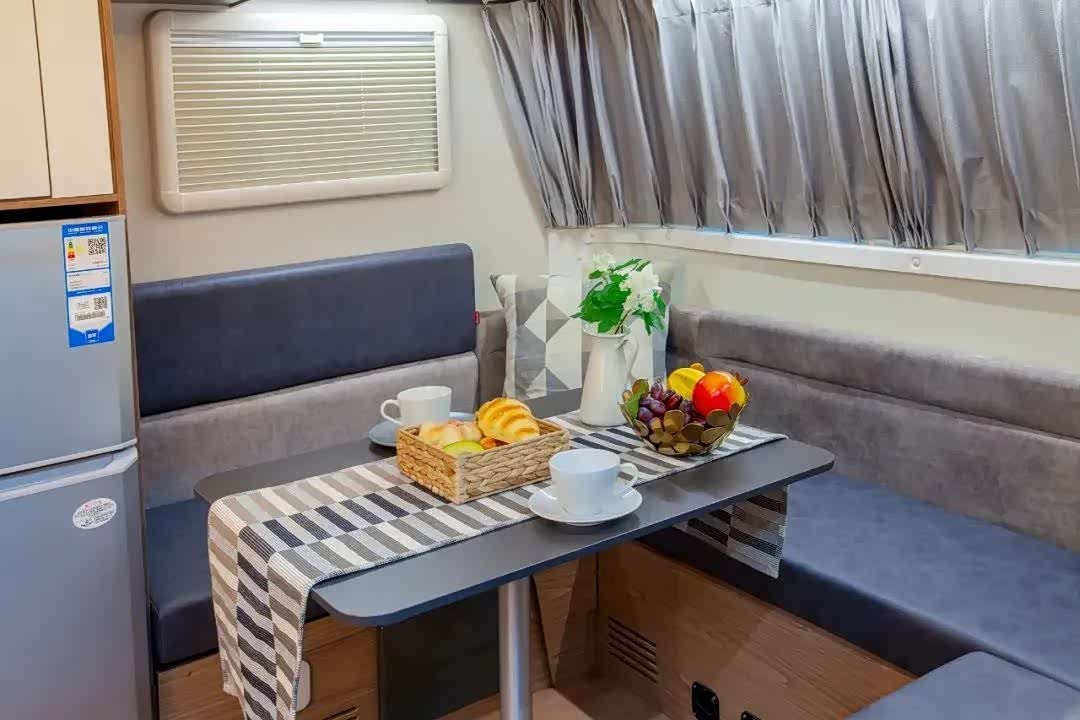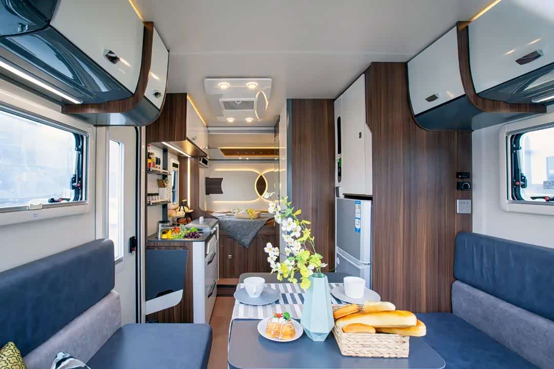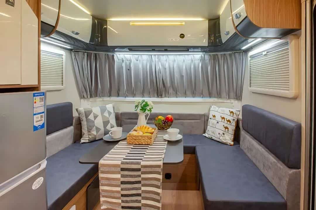 来到车辆内部,车辆仅车厢的长度为4700mm,内高1950mm,拖挂房车空间上优势突出。车内主要分为三个部分,最前方U型沙发会客区、中部厨卫分列左右、尾部固定床铺休息区,各区域相对独立,满足游玩时的各项需求。与外观相同,内饰一样拥有多种定制化样式可选:包括暗灰色主题榆木家具、咖啡色木纹北美胡桃、灰白色丹麦枫木和大面积色块极简主义。
