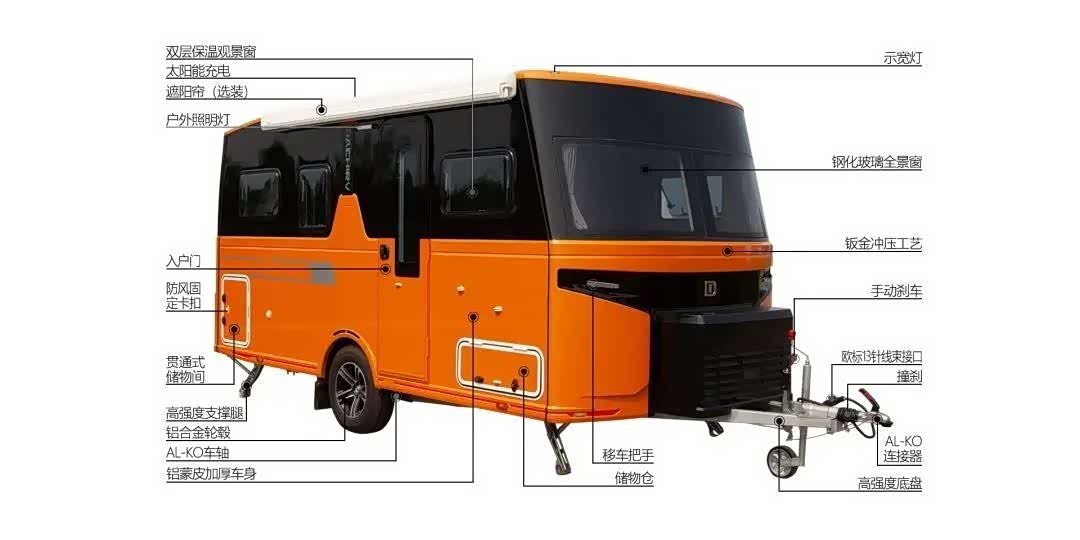 在车身材质方面,大驰智能房车运用汽车制造工艺,在车辆前方安装了两块大尺寸的汽车钢化材质玻璃,拥有良好的硬度、透光度表现。车身外侧主要配置了贯通式的储物仓、遮阳棚、外置淋浴器、市电接口、注水口等设施。